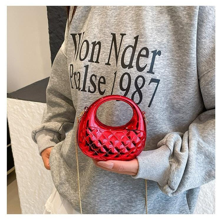 The ARC AND ALLOY is a striking fusion of heritage craftsmanship and futuristic aesthetics, redefining the iconic quilted silhouette for the modern era. This sculptural hardshell clutch features a high-shine, liquid-chrome finish that transforms the traditional diamond-quilted pattern into a reflective, multi-dimensional masterpiece. Defined by its seamless, integrated circular handle and soft crescent base, the piece balances architectural rigidity with a fluid, ergonomic form. Whether styled as a bold crossbody via its delicate chain or carried as a high-fashion top-handle, the ARC AND ALLOY serves as a luminous, avant-garde statement that captures the light and commands attention.