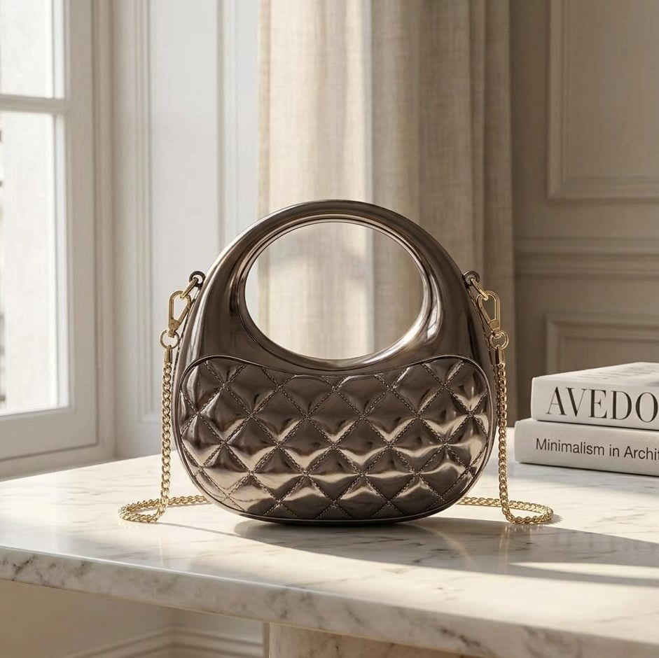 The ARC AND ALLOY is a striking fusion of heritage craftsmanship and futuristic aesthetics, redefining the iconic quilted silhouette for the modern era. This sculptural hardshell clutch features a high-shine, liquid-chrome finish that transforms the traditional diamond-quilted pattern into a reflective, multi-dimensional masterpiece. Defined by its seamless, integrated circular handle and soft crescent base, the piece balances architectural rigidity with a fluid, ergonomic form. Whether styled as a bold crossbody via its delicate chain or carried as a high-fashion top-handle, the ARC AND ALLOY serves as a luminous, avant-garde statement that captures the light and commands attention.