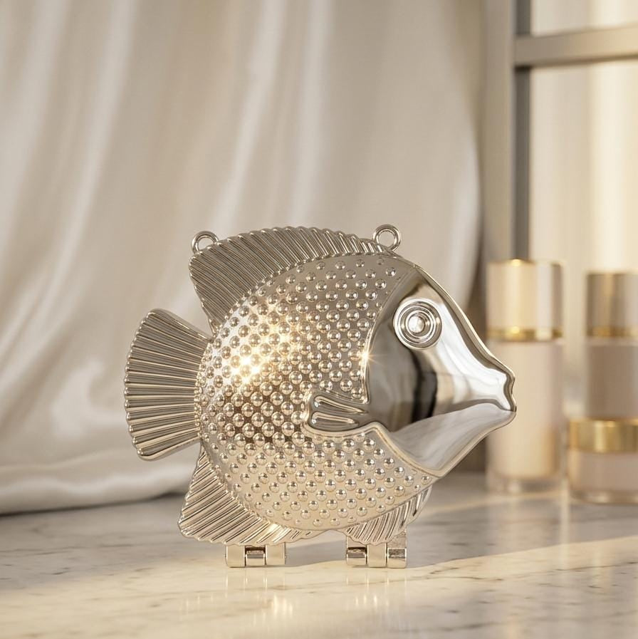 Inspired by the glittering waters of the Mediterranean, this silver fish clutch is for the woman who doesn't follow trends—she sets them. Part vintage curiosity, part modern statement, its unique mesh-like frame offers a peek into its "scales" while keeping your essentials secure. Whether you're styling it with a sharp blazer for a gallery opening or a flowing silk dress for a coastal dinner, it’s the perfect blend of wit and luxury.