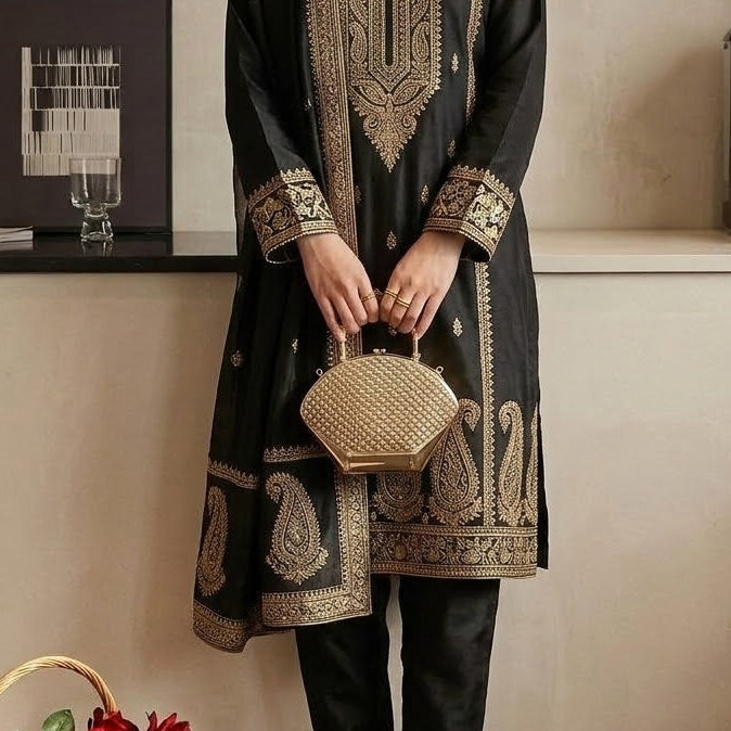 Features: Integrated top handle, detachable gold-tone chain strap, and secure clasp closure.