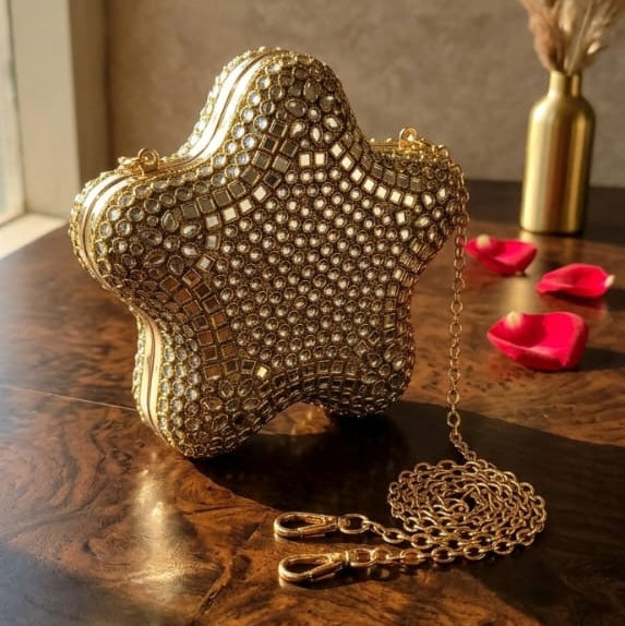The Astral Étoile is a celestial masterpiece that captures the mesmerizing brilliance of the night sky in a structured, high-fashion silhouette. This star-shaped minaudière is meticulously adorned with a dense mosaic of hand-set crystals, creating a multifaceted surface that scintillates from every angle. Framed in a rich, antique-gold setting and paired with a delicate crossbody chain, the piece serves as a striking "jewelry-meets-accessory" statement. Perfect for galas and red-carpet moments, the Astral Étoile balances whimsical astronomical design with opulent craftsmanship, ensuring you carry a piece of the cosmos wherever you go.